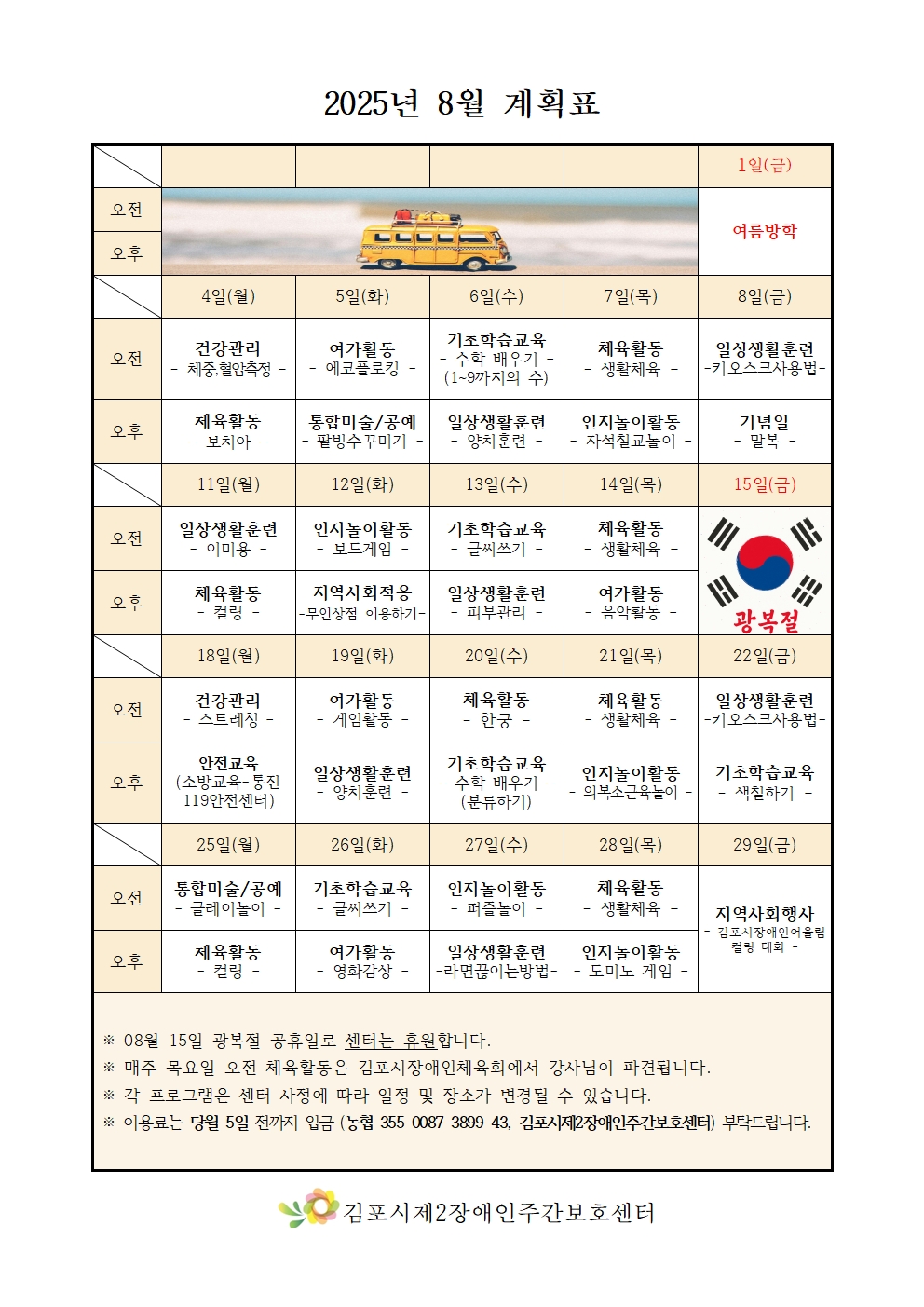 팩스 : 031-983-0421 / 이메일 : gimpo2nd@naver.com후원계좌 : 농협 355-0087-3898-13 (김포시제2장애인주간보호센터)
