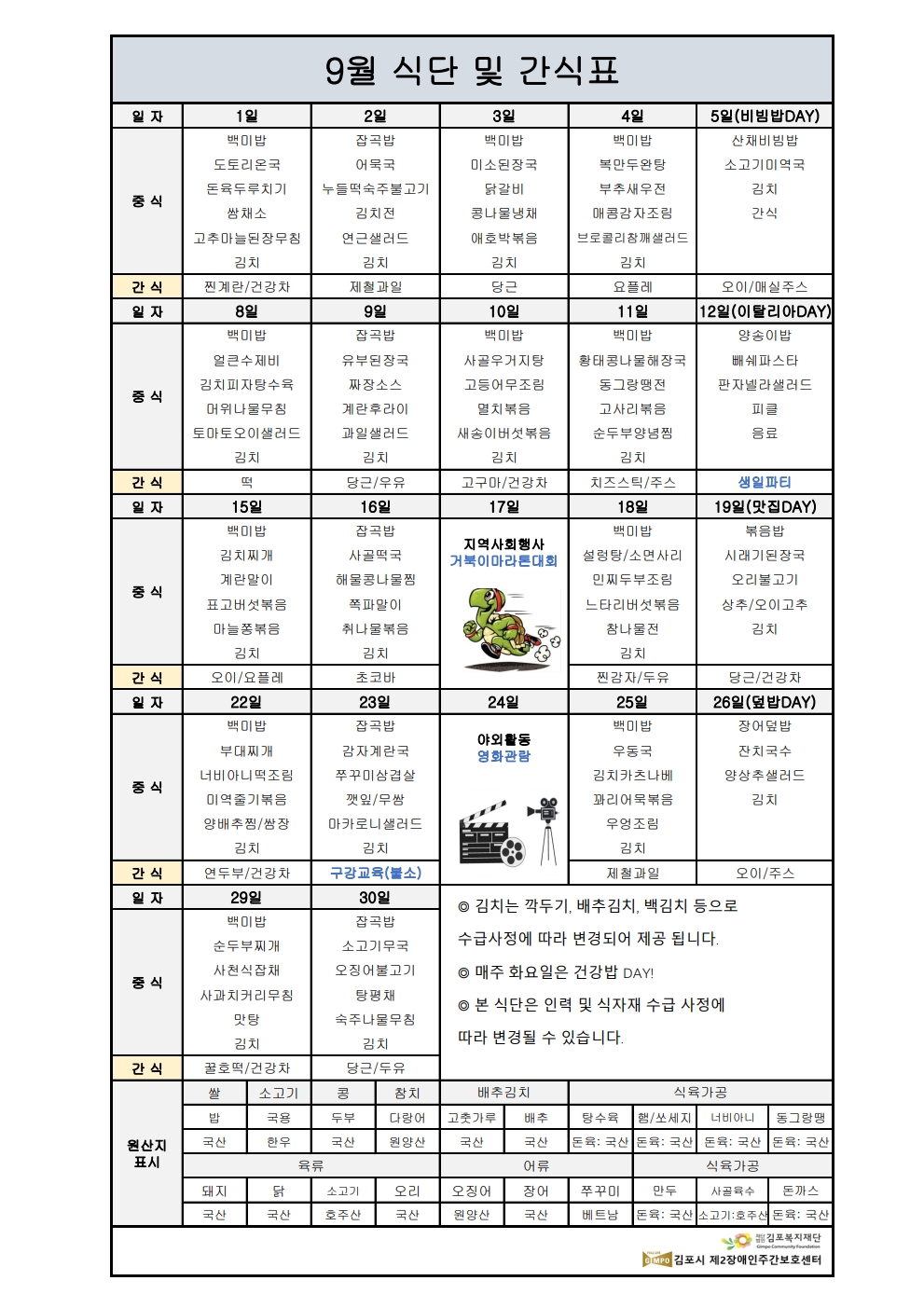 ㅇㅇ 2025년 09월 식단 및 간식표를 공지드립니다.