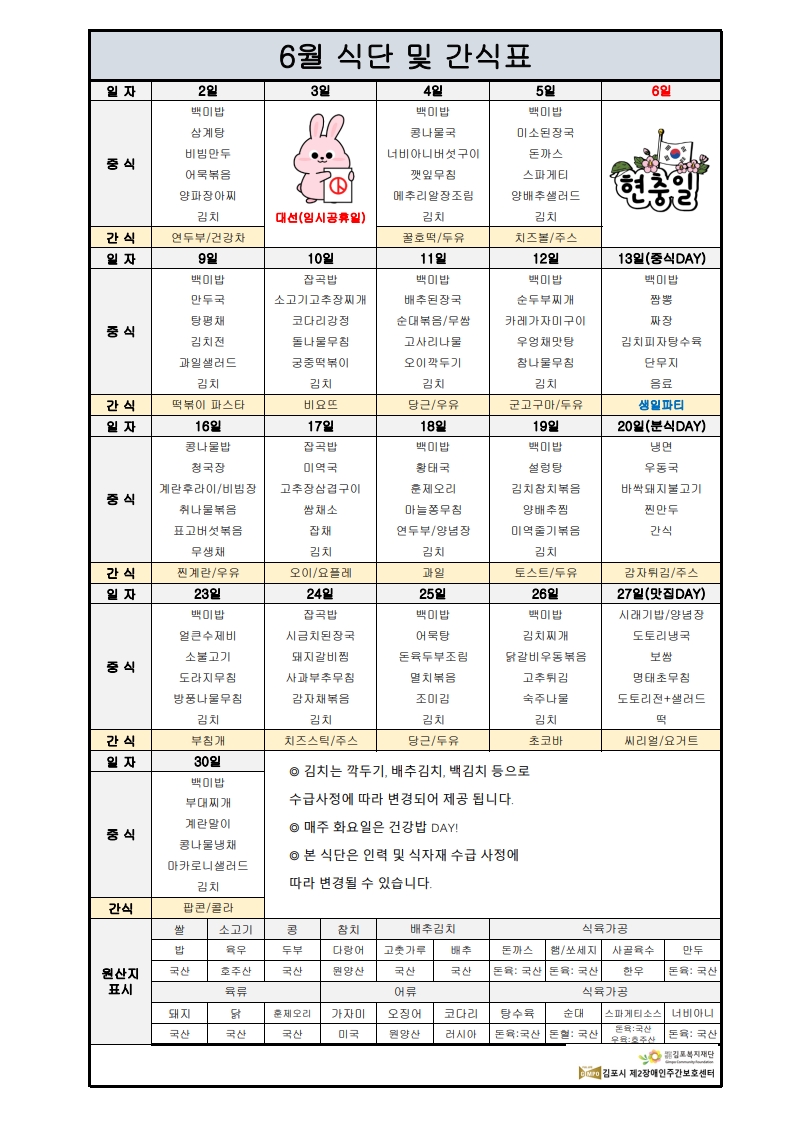 ㅇㅇ 2025년 06월 식단 및 간식표를 공지드립니다.